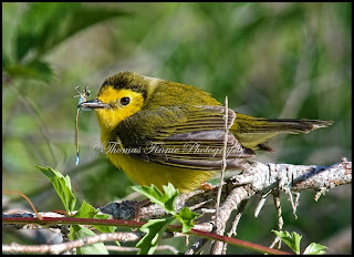 This was my favorite picture of the day. The little Hooded Warbler shook the damselfly vigorously, flipped it up, grabbed it by the head with his beak and down the hatch it went. I was sorry that I missed the next picture.